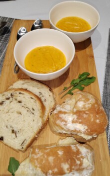 While we were enjoying the champagne, they brought us the starter, which was the Kashmiri pumpkin soup with olive bread.